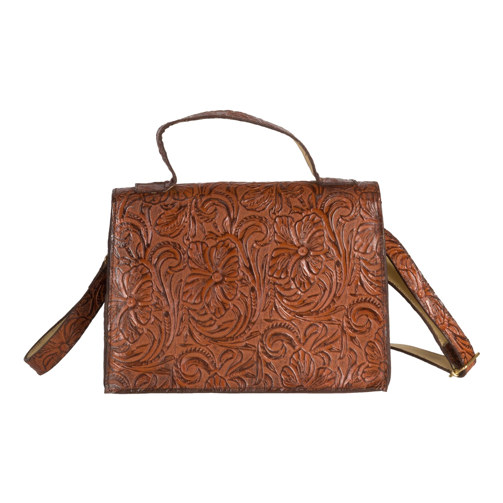 Esta elegante bolsa artesanal de piel de res con grabado cincelado de flores Shedron y detalles en latón vintage combina elegancia y funcionalidad, ofreciendo un estilo único y sofisticado con su asa ajustable y broche imantado dorado.