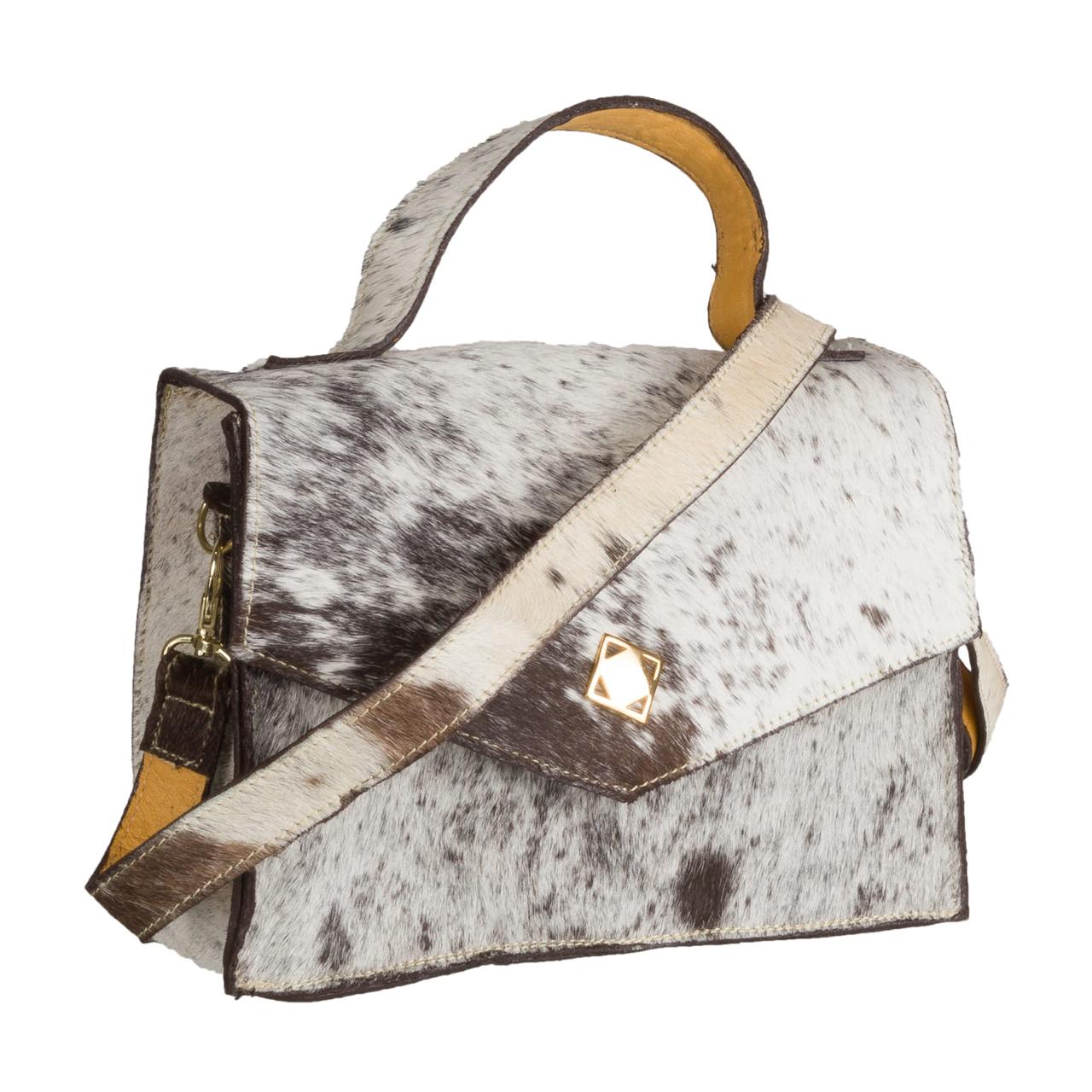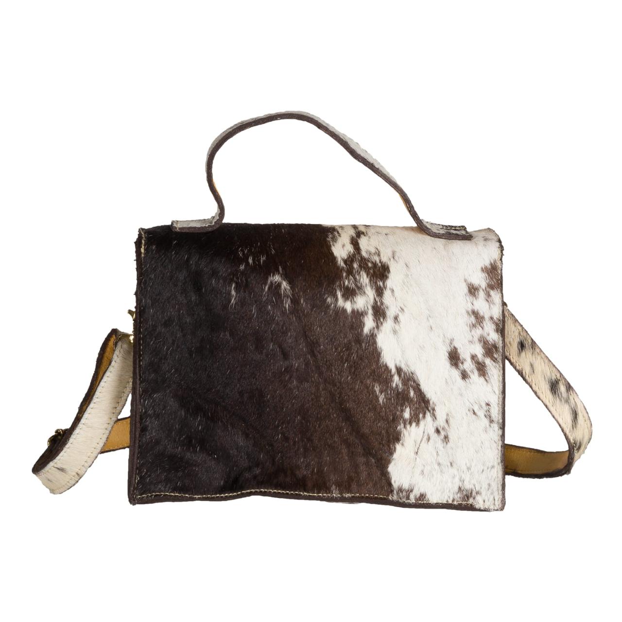 Este bolso de mano está elaborado con piel de vaca genuina, con un diseño de pelo pinto (manchas negras y marrones) que le da un aspecto natural y auténtico. El bolso tiene un estilo clásico de cartera con solapa, que se cierra con un broche dorado elegante. El asa es de cuero suave y resistente, lo que permite llevar el bolso con comodidad. El interior del bolso completamente en forro de res ultrasuave excelente para guardar objetos personales.