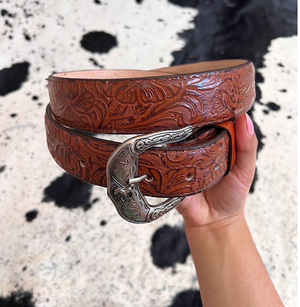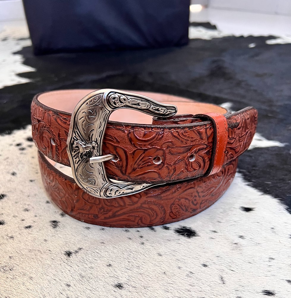 Este cinturón de piel con grabado cincelado de flores Shedron y hebilla texana clásica combina resistencia y elegancia, perfecto para un look auténtico y sofisticado.