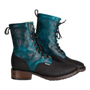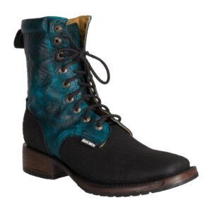 Estas botas son un verdadero ejemplo de artesanía de alta calidad. Hechas 100% a mano, están confeccionadas con piel genuina de cuello de toro, lo que les otorga una apariencia robusta y elegante con un acabado en verde azulado en la parte superior y negro en la puntera. Cuentan con un sistema de cordones con ojillos metálicos para un ajuste seguro y cómodo. Además, incorporan un injerto de hule anti derrapante en la suela, lo que proporciona un excelente agarre y seguridad tanto en el trabajo como en el día a día casual. Su diseño combina funcionalidad y estilo, siendo ideales para actividades laborales o para lucir en un outfit casual urbano.