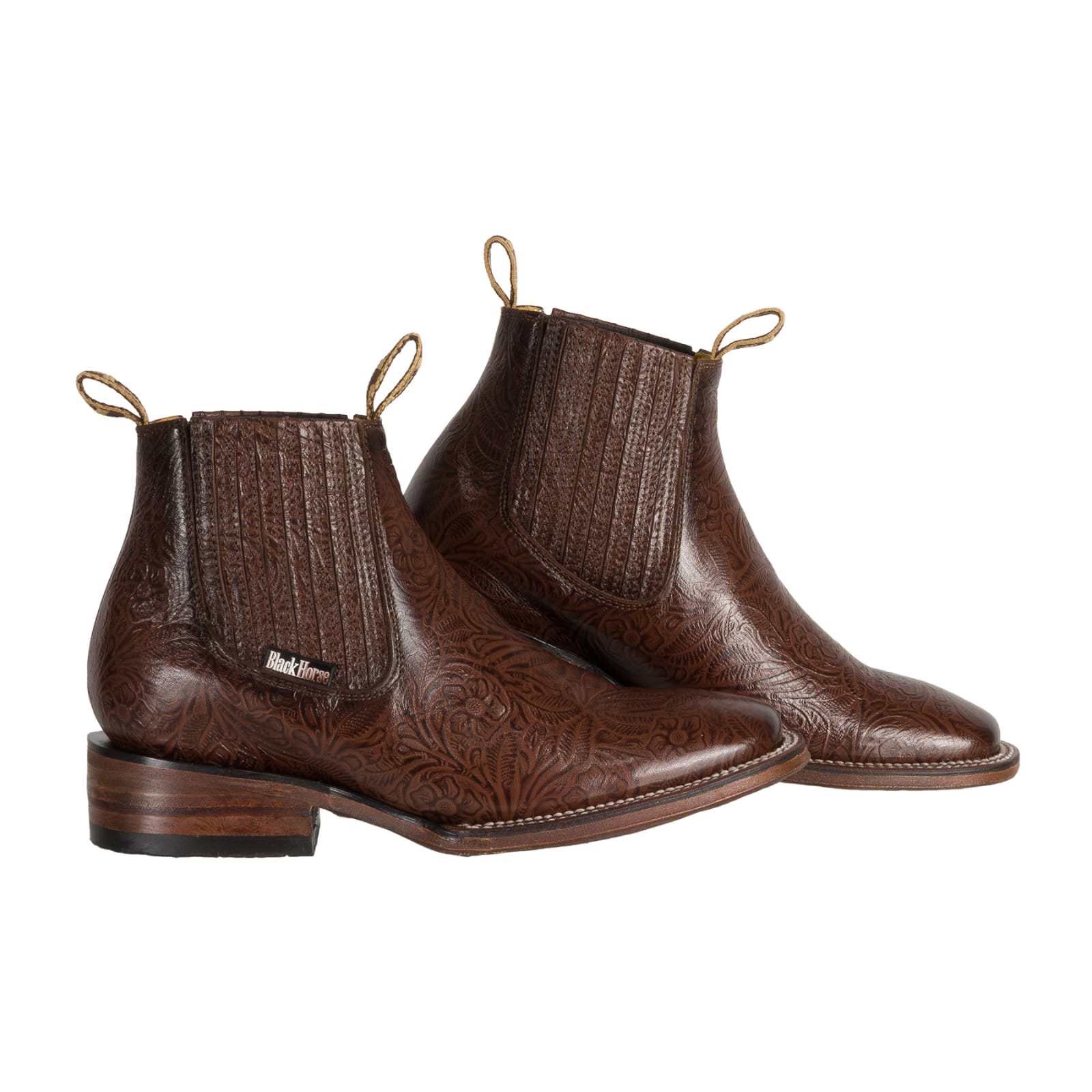 Este exclusivo botín para dama combina autenticidad y estilo en un diseño artesanal. Fabricado en piel de res cincelada con flores chocolate y efecto sombreado, cada par es único y especial.