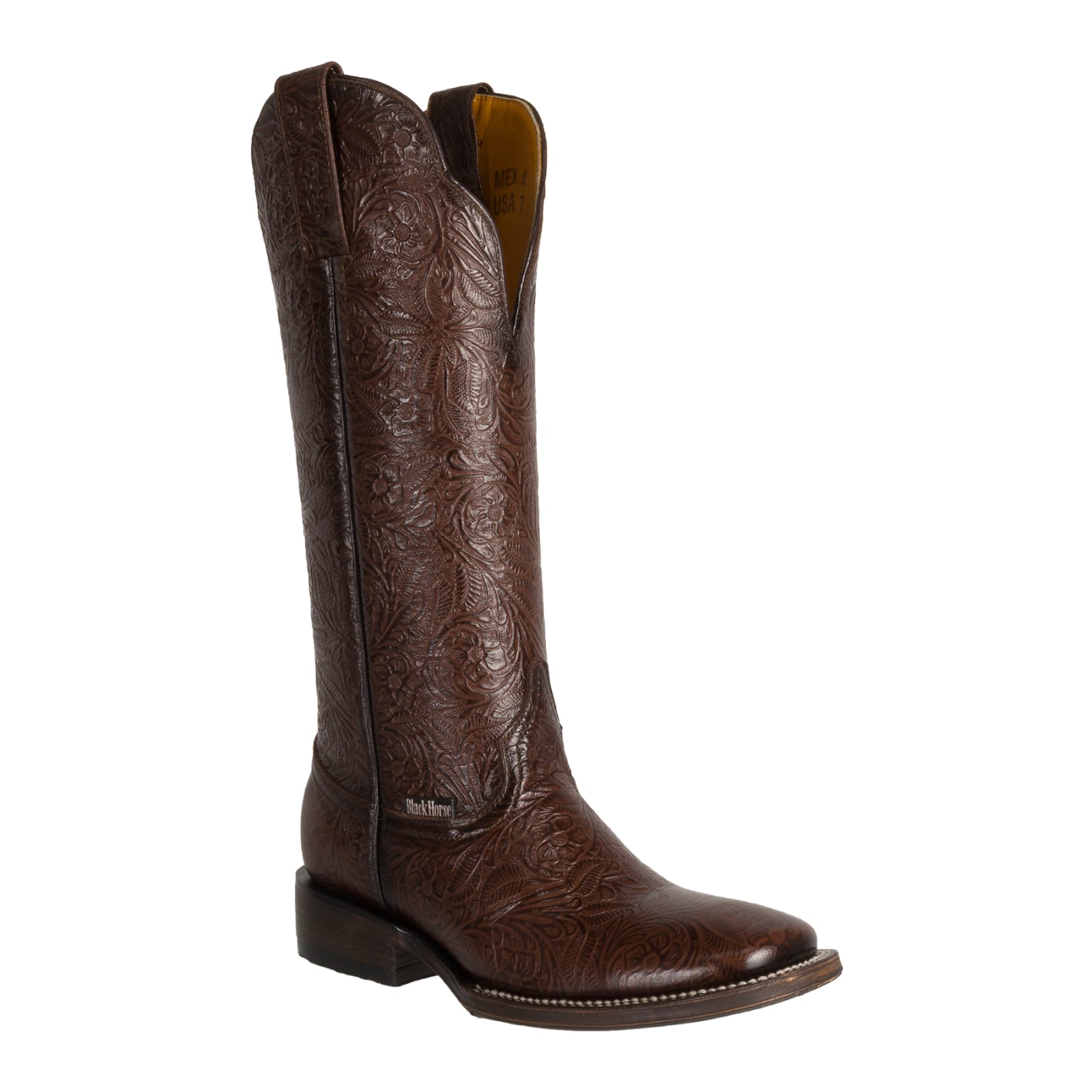 Esta exclusiva bota vaquera para dama destaca por su diseño artesanal en piel de res con cincelado floral chocolate y efecto sombreado, ofreciendo confort y un estilo único en cada par.