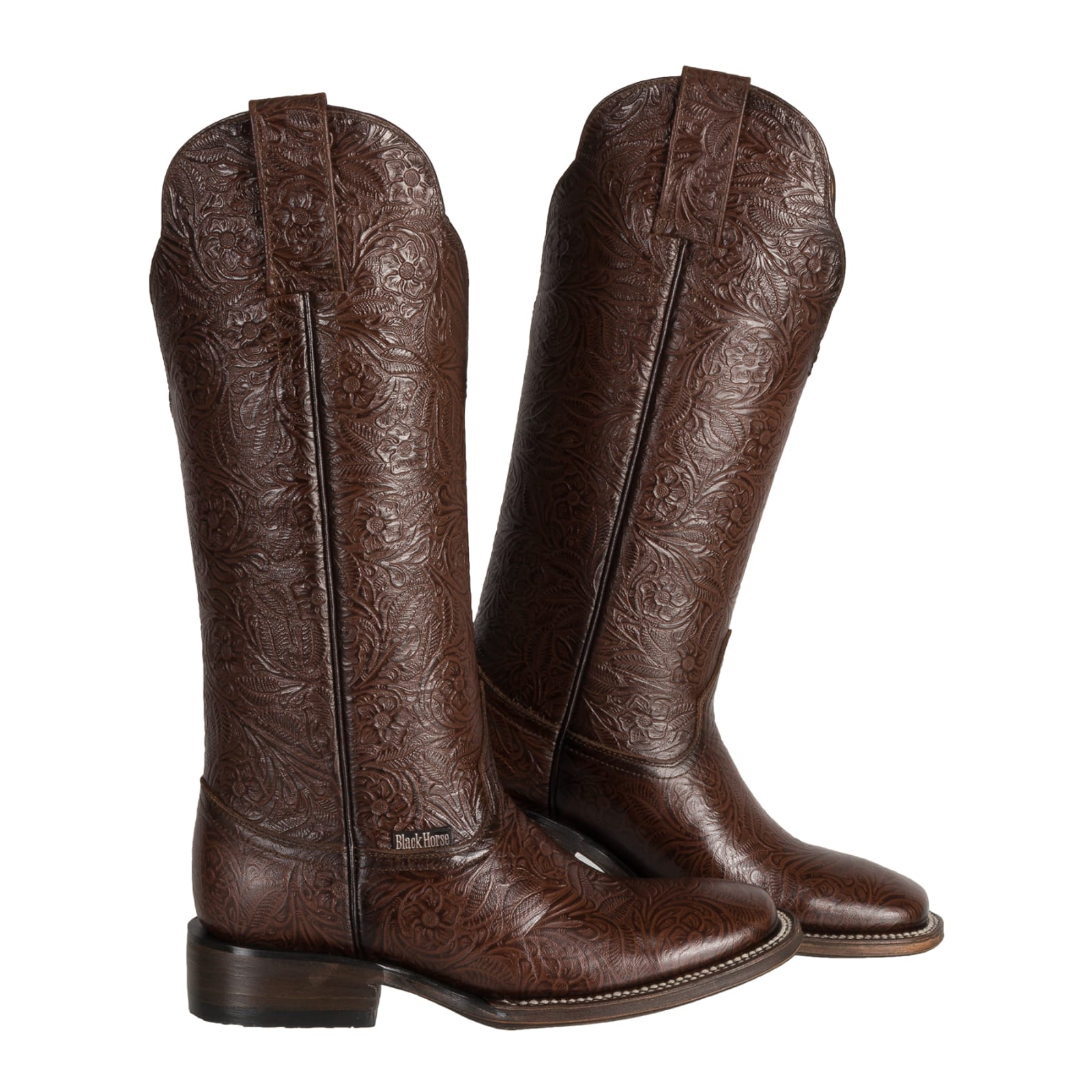 "Esta exclusiva bota vaquera para dama combina estilo y sofisticación en un diseño artesanal. Fabricada en 100% piel de res con cincelado de flores chocolate y efecto sombreado, cada detalle es trabajado de manera 100% artesanal, haciendo que cada par sea único y exclusivo.