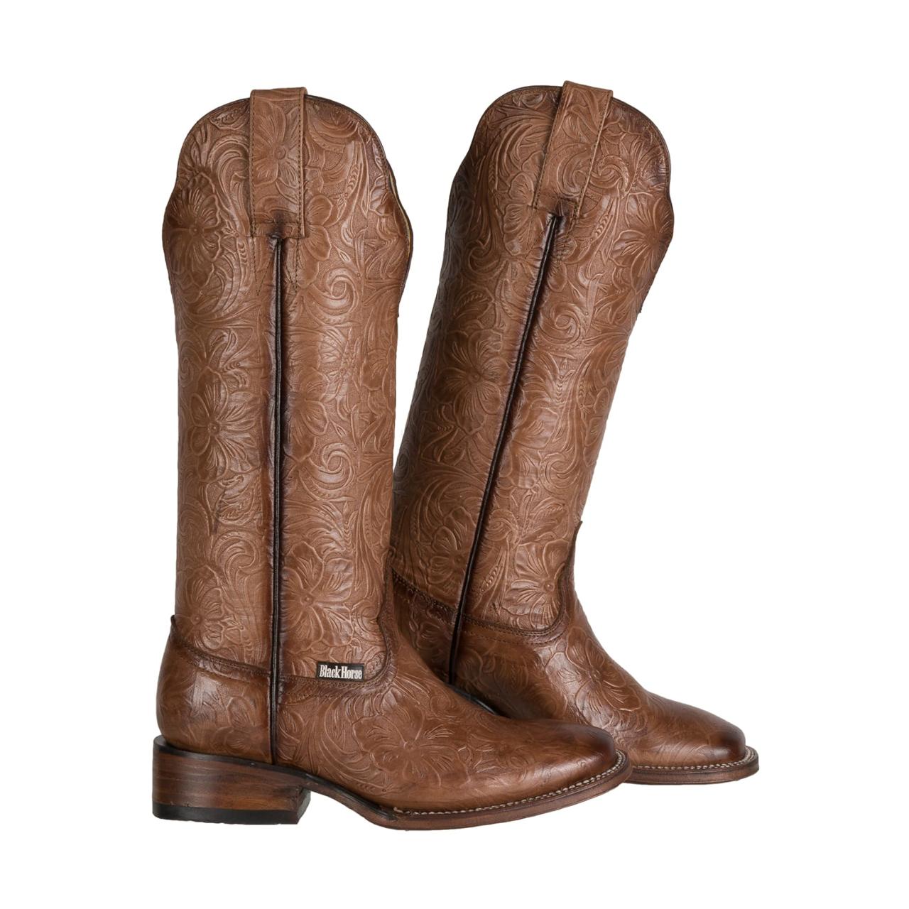 Esta elegante bota vaquera para dama resalta por su fina fabricación en piel de res con delicado cincelado floral latte y acabado sombreado, brindando un toque de autenticidad y estilo único.