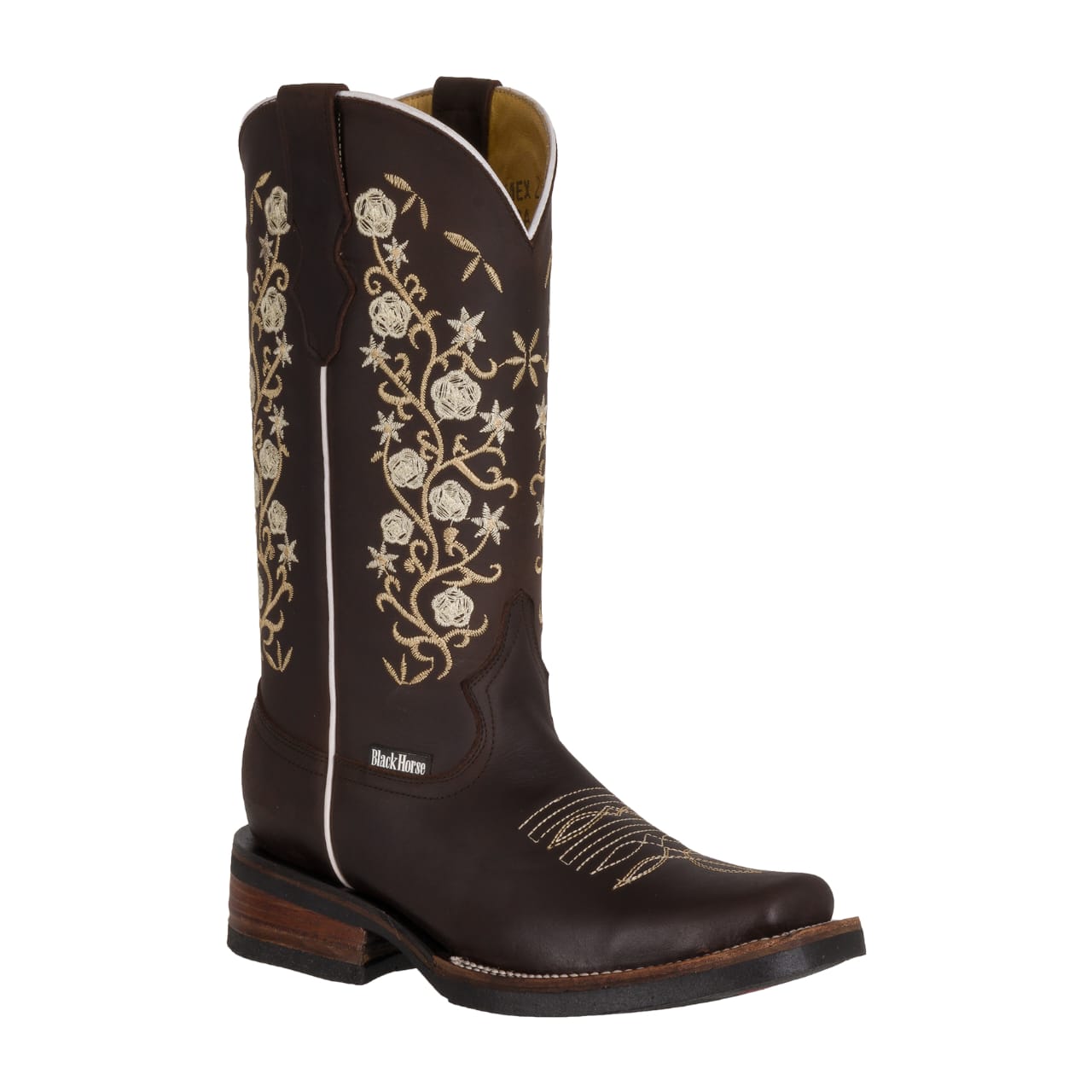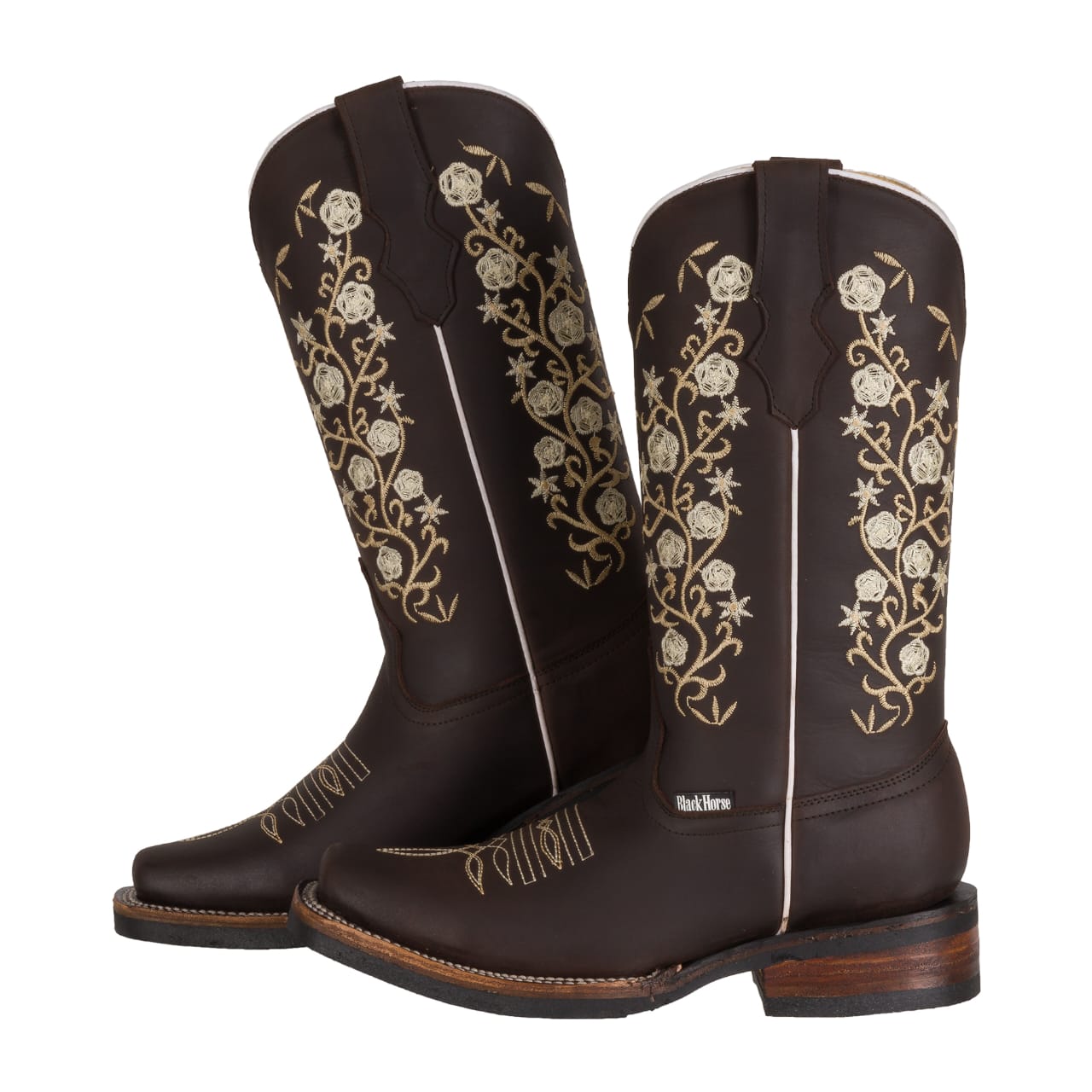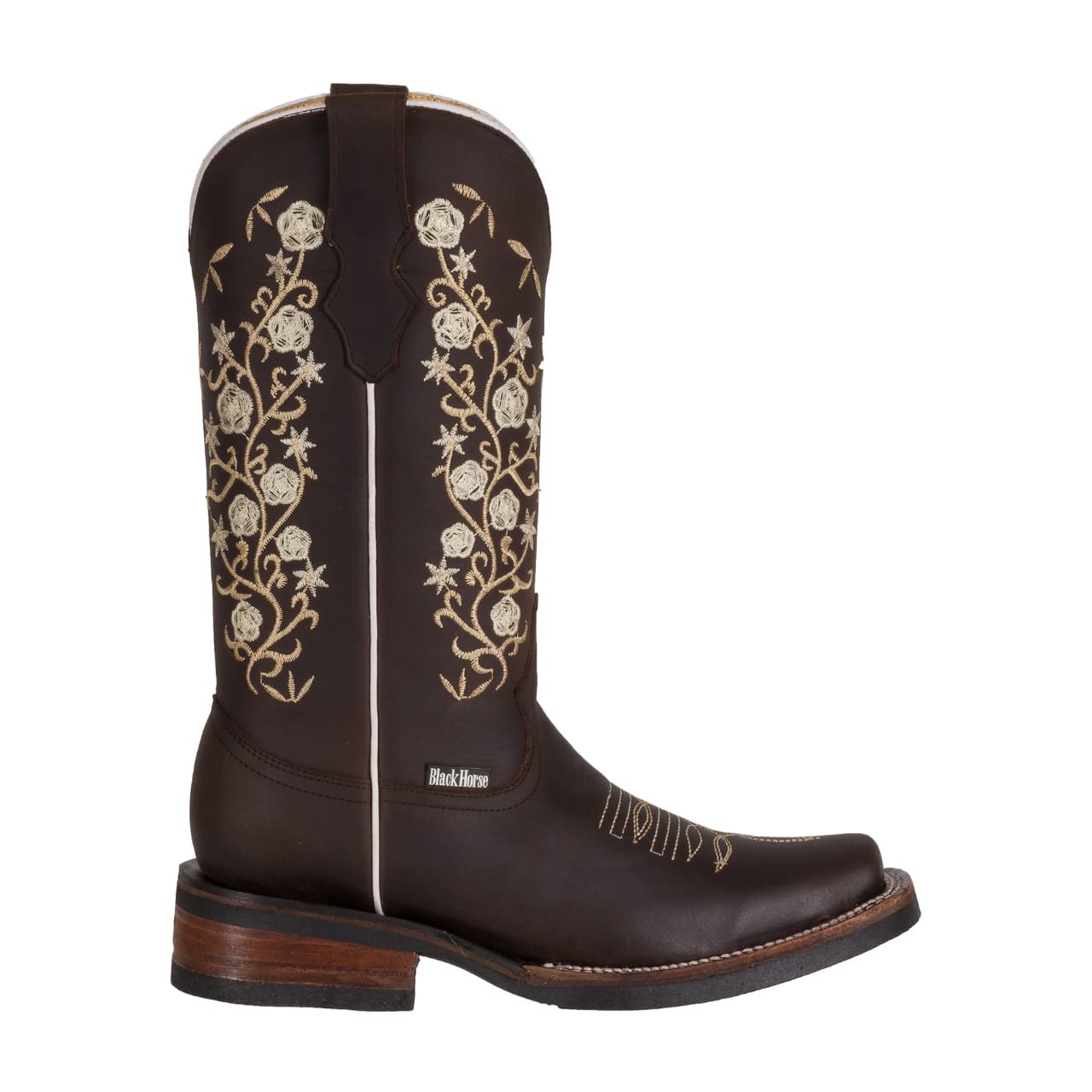 Esta auténtica bota vaquera para dama en piel de res Crazy Chocolate destaca por su diseño artesanal, realzado con un delicado bordado de flores y tallos que aporta un estilo único y femenino.
