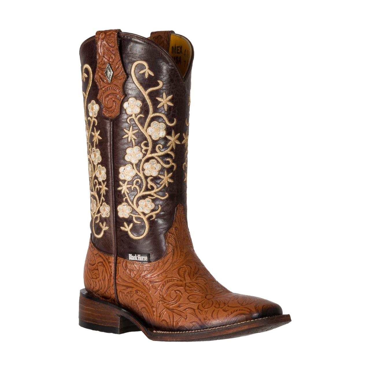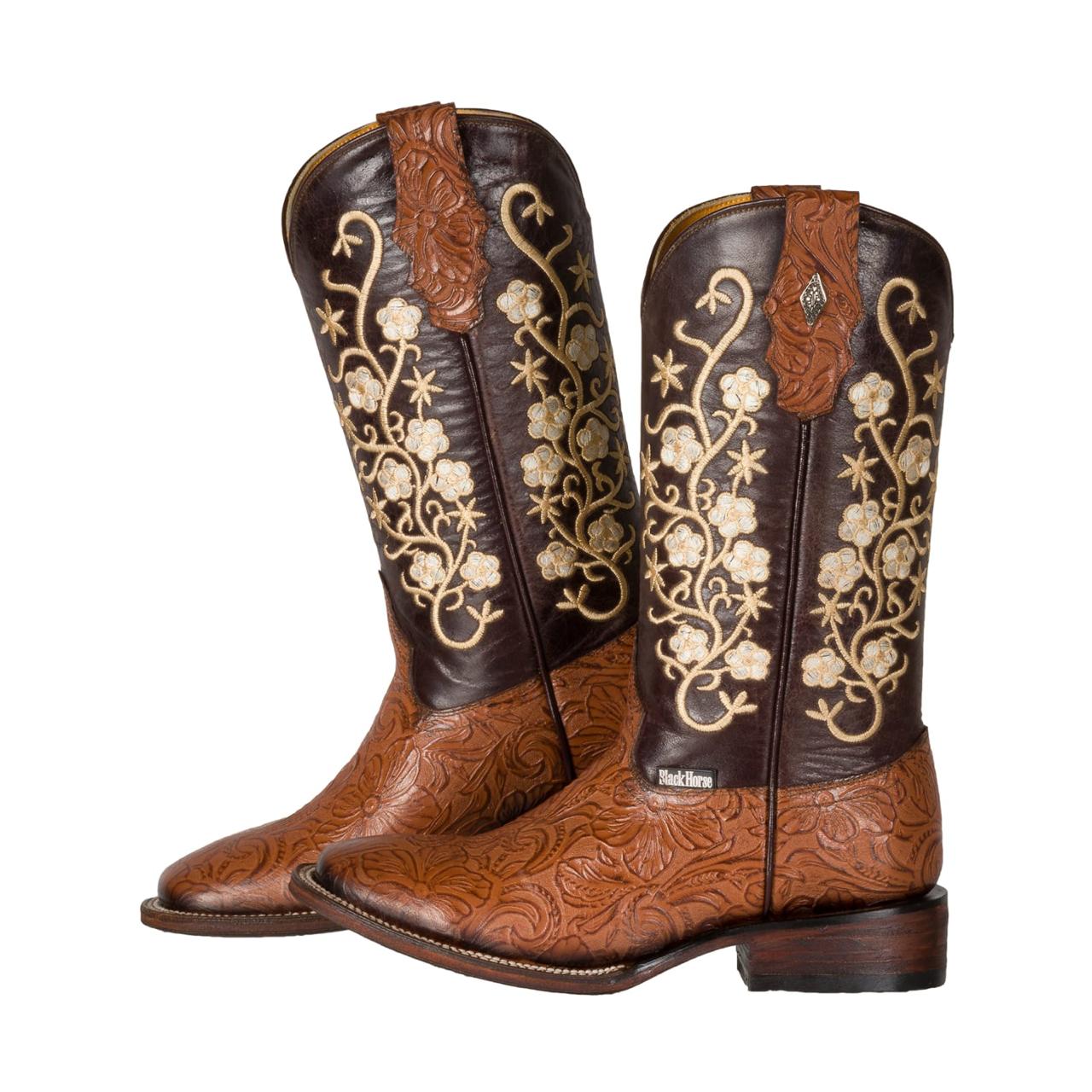 "Esta sofisticada bota vaquera para dama elaborada en 100% piel de res grabada, con cincelado de flores shedron y un delicado bordado de tallos pita, oro y beige, logrando un diseño único y artesanal.