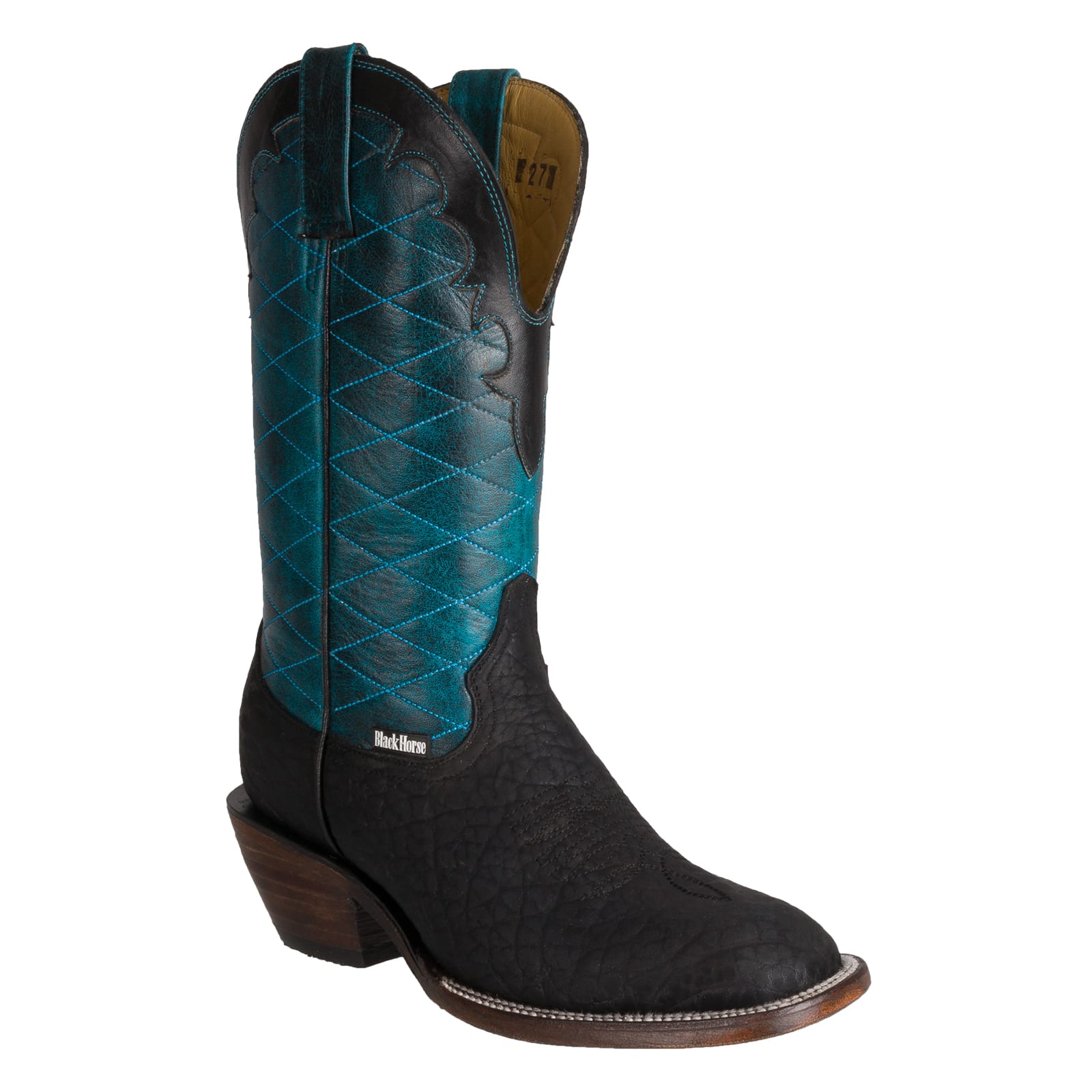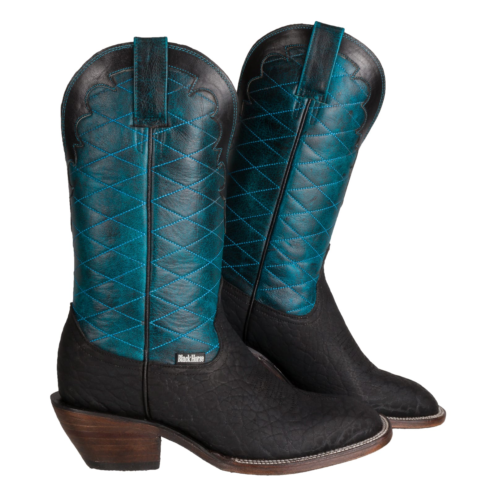 Estas botas vaqueras THOT son una pieza auténtica elaborada con piel de cuello de toro en un intenso contraste negro-turquesa que resalta su elegancia natural y audaz.