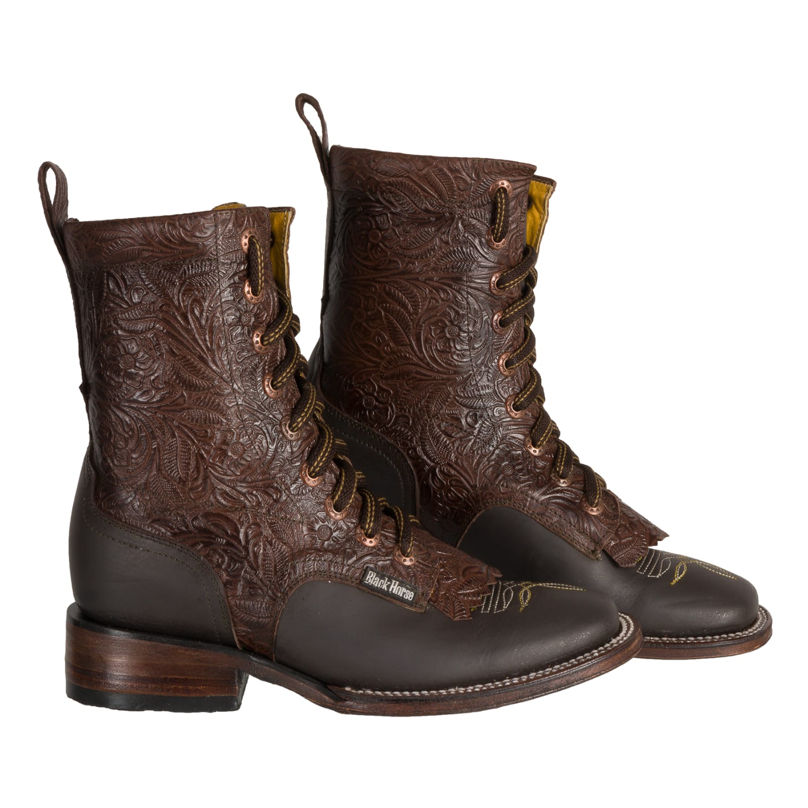 Esta exclusiva bota Lace Up (Leiser) vaquera para dama combina estilo y sofisticación en un diseño artesanal. Fabricada en 100% piel de res Creazy café chocolate con tubo cincelado y grabado de flores chocolate con efecto sombreado, cada detalle es trabajado de manera artesanal, haciendo que cada par sea único y exclusivo.